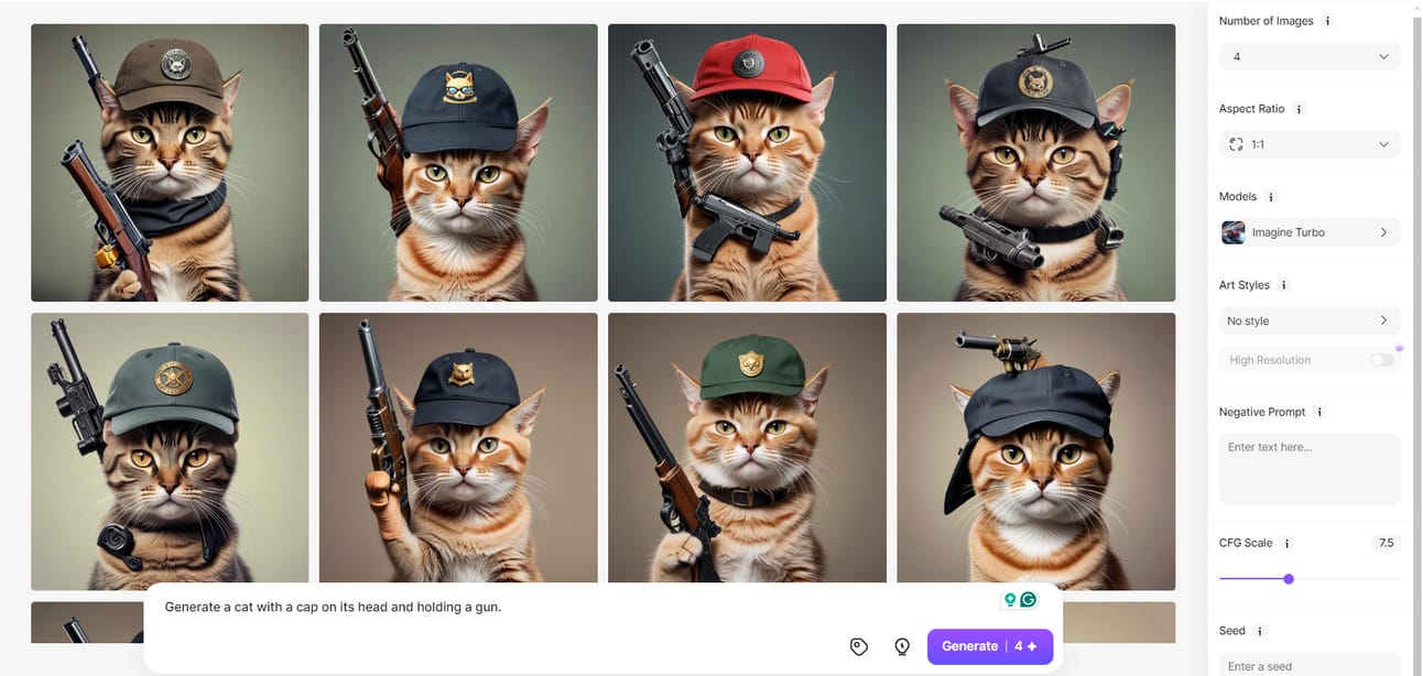 Enter Your Prompt: Input your creative idea, such as “Generate a cat with a cap on its head and holding a gun,” and adjust the aspect ratio to your preference. Click "Generate."