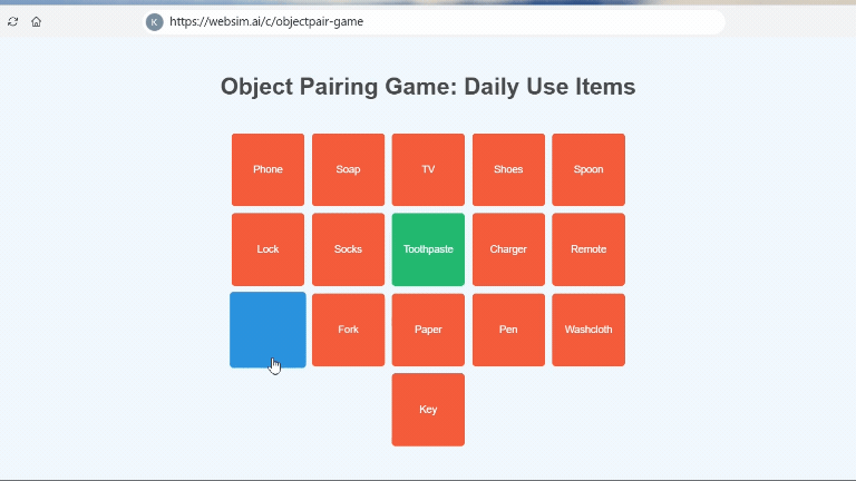 Created a game using Websim where players match daily use items with their pairs.
