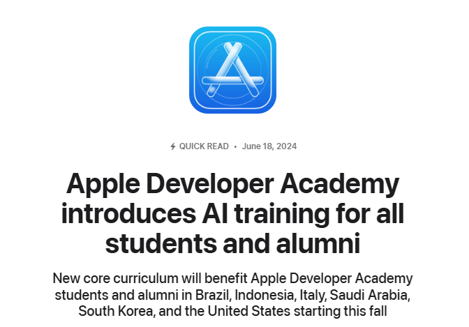 Apple will introduce AI-focused training in the core curriculum for all Apple Developer Academy students and alumni in Brazil, Indonesia, Italy, Saudi Arabia, South Korea, and the U.S. this fall. The training aims to enhance skills in coding, design, professional development, and marketing, incorporating Apple's values of inclusive and impactful design.