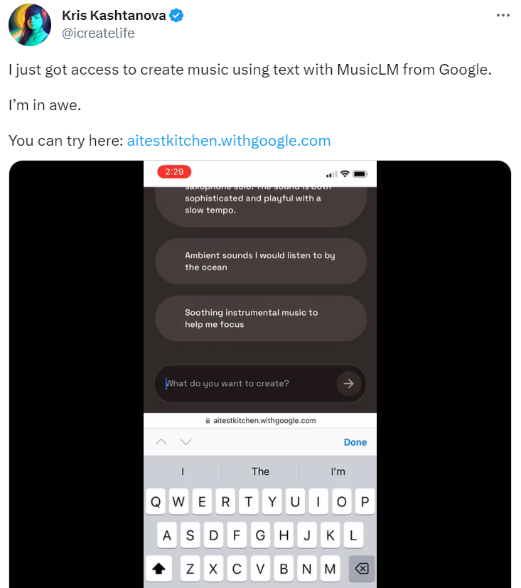 “I just got access to create music using text with MusicLM from Google.