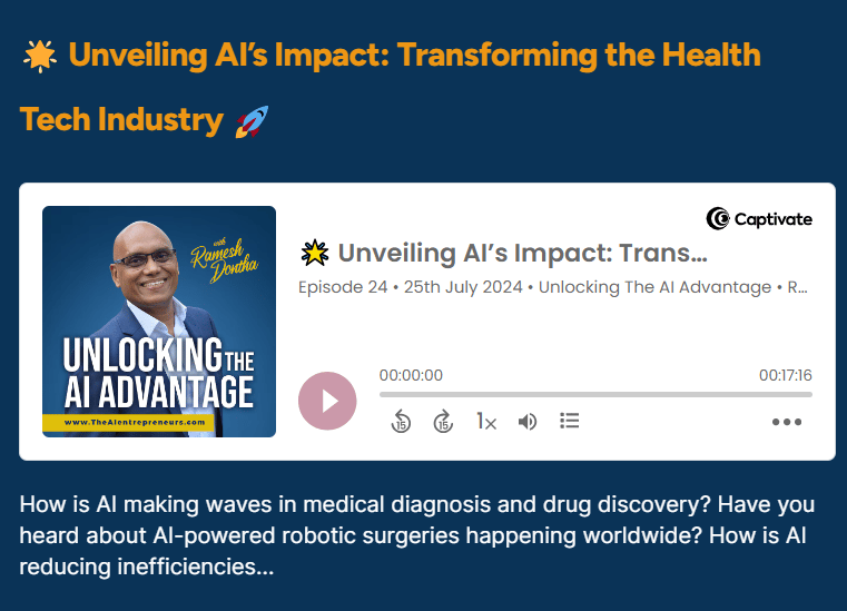 In our newest podcast episode, host Ramesh Dontha deep dives into the groundbreaking ways AI revolutionizes the health tech industry. Discover how AI transforms medical diagnosis, speeds up drug discovery, enhances patient experiences, and manages healthcare data, and robotic surgeries.