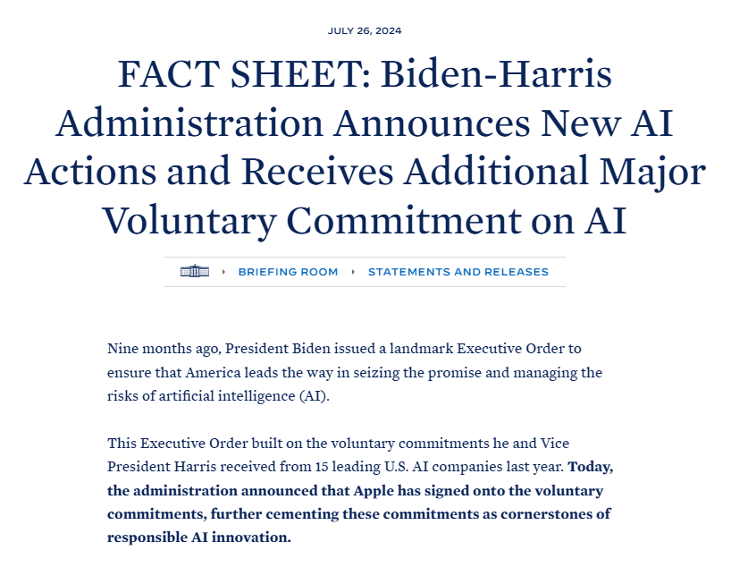 Apple has signed the White House’s voluntary commitment to developing safe, secure, and trustworthy AI, marking a significant step in AI ethics. This aligns Apple with tech giants like Google, Microsoft, and OpenAI, reinforcing AI safety protocols.