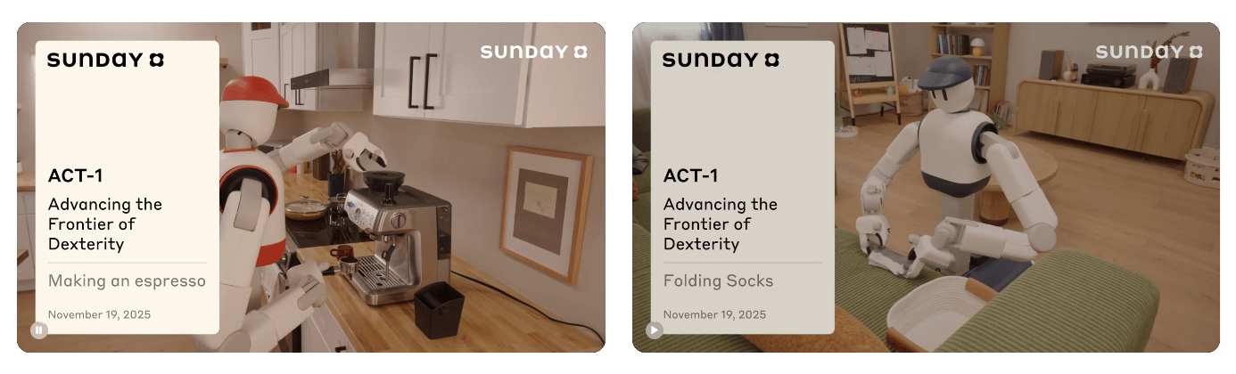 Sunday debuts ACT-1, a robot foundation model trained without teleoperation. Using a Skill Capture Glove and Skill Transform, human motion becomes robot data — enabling long, multi-step tasks like loading dishwashers, folding socks, and pulling espresso shots.