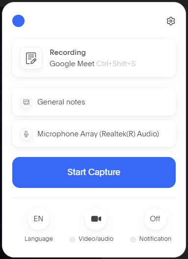 Step 3: Select which type of notes you want to take, General, Technical, Sales or Customer Success (CS). Press “Start Capture” to start recording your meeting.