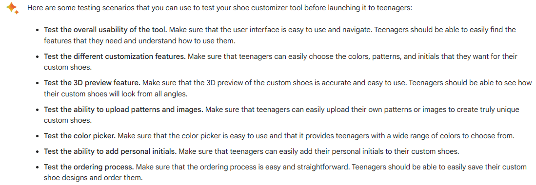 Testing and Deployment: Prior to launching the customizer tool, use Bard to plan testing scenarios. Ensure that teenagers can easily use the tool to design their own shoes. Once testing is complete, deploy the tool on your website for a personalized shopping experience.
