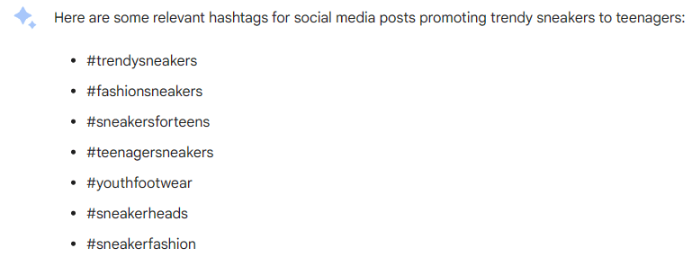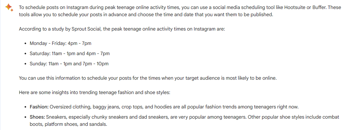 Scheduling and Trend Analysis: Bard can help you schedule posts during peak teenage online activity times, and it can provide insights into trending teenage fashion and shoe styles.