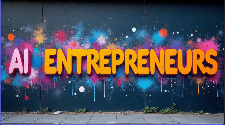 Prompt 1 : Photo of vibrant wall covered in dark graffiti "AI ENTREPRENEURS". Probably taken from a phone.