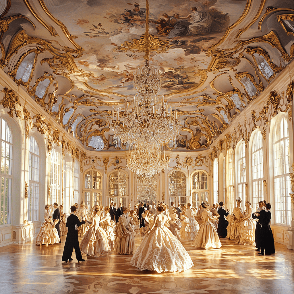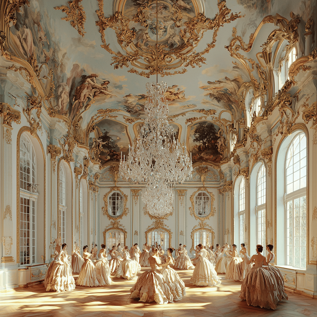 Create an opulent Rococo-style ballroom filled with intricate gold leaf decorations, pastel-colored walls adorned with delicate floral patterns, and a grand crystal chandelier hanging from the ceiling. The room should be filled with elegantly dressed figures in 18th-century attire, engaging in a lively dance. Soft, natural light filters through tall, arched windows, casting gentle shadows that highlight the ornate details of the room — v 6.1—q2