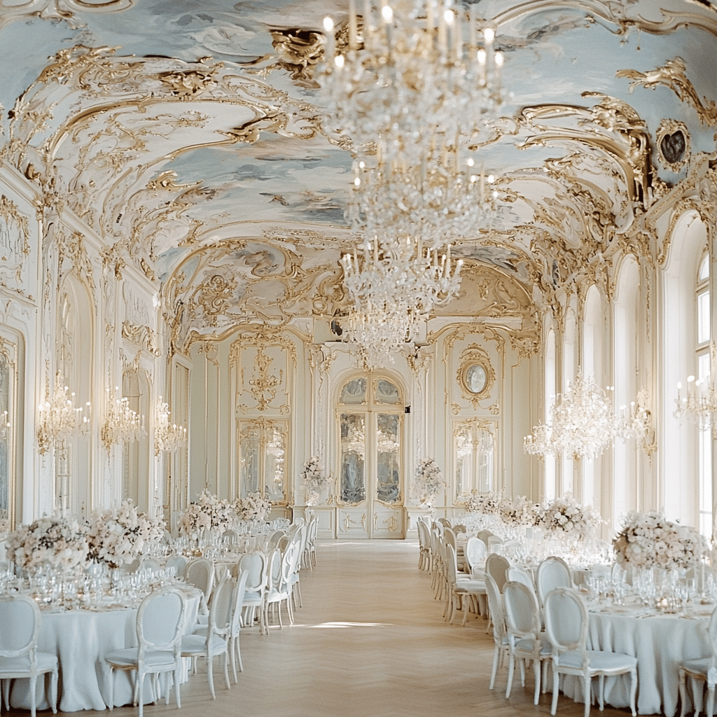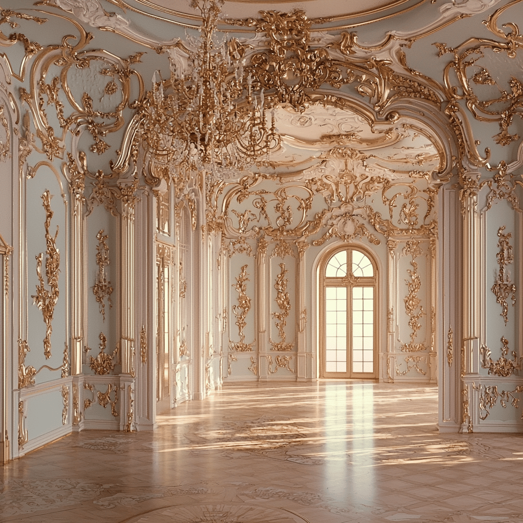 Design a rococo ballroom with pastel-colored walls, intricate gold leaf decorations, and elegant chandeliers— v 6.1—q2