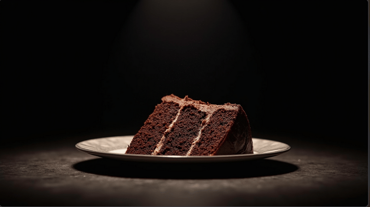Prompt 2 : Shoot a dark, moody scene with a plate of rich, chocolate cake, lit by a single overhead light. Focus on the texture and shadows, with a deep, dark background that emphasizes the dessert.