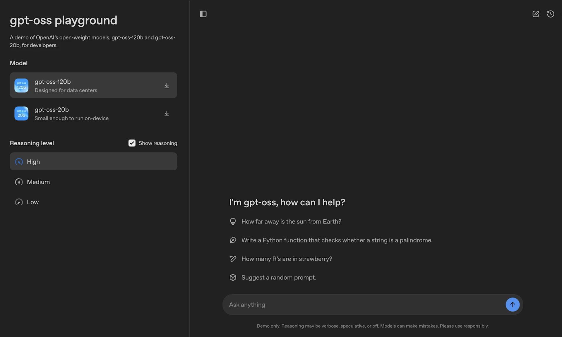 120b runs in data centers or on high-end desktops; 20b runs on standard devices with 16GB memory.