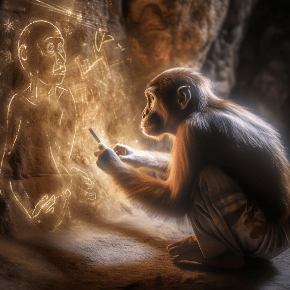 closeup of a monkey drawing ancient drawings on a cave wall , long exposure experimental cinematography –ar 7:5 –style raw –v 6.0