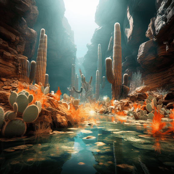 a canyon , long exposure experimental cinematography against cactus backdrops –ar 7:5 –style raw –v 6.0
