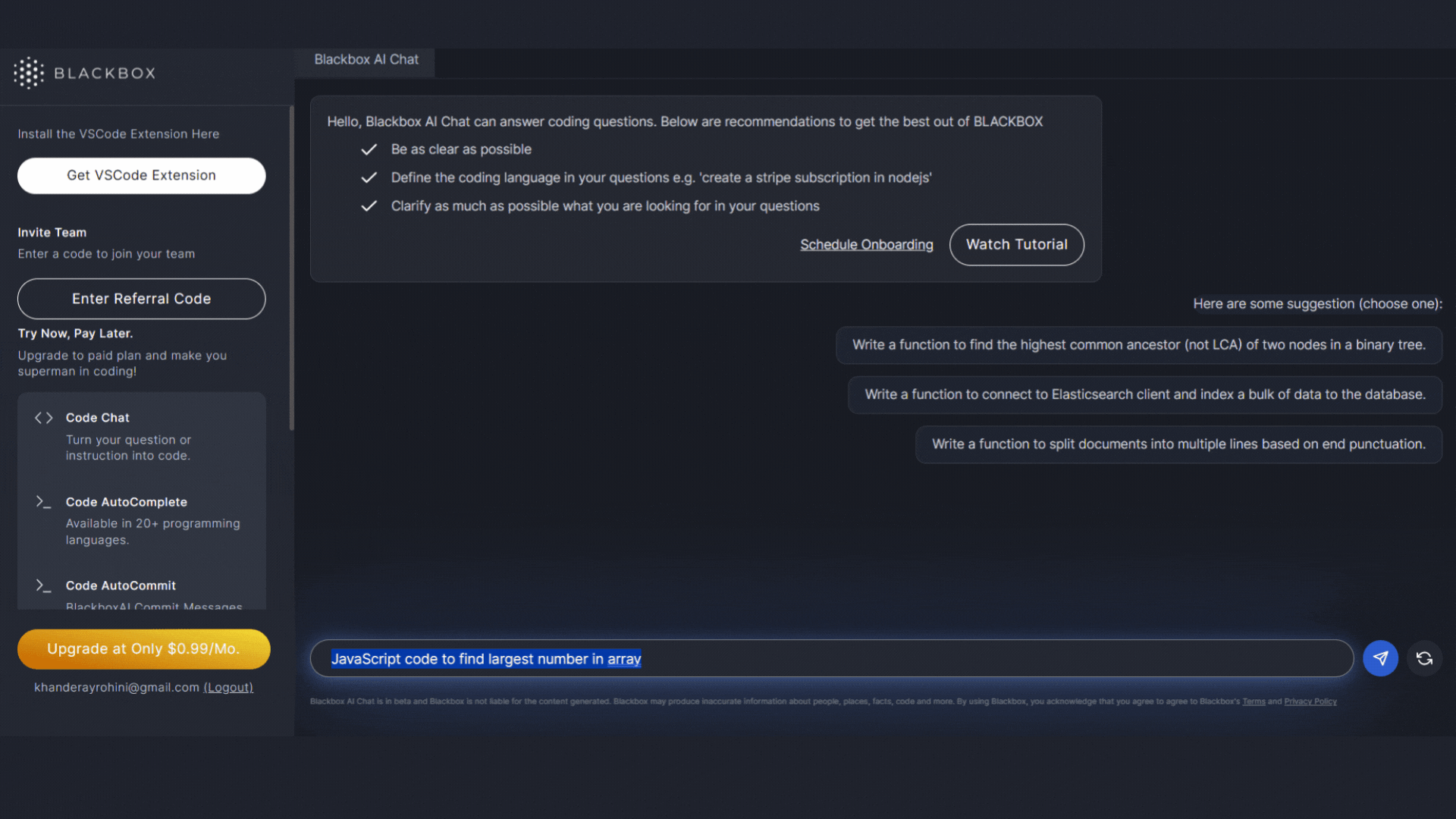 Blackbox AI is an AI-powered coding assistant that helps programmers code faster and better. It offers several features like code autocomplete, search, auto commit and code chat.