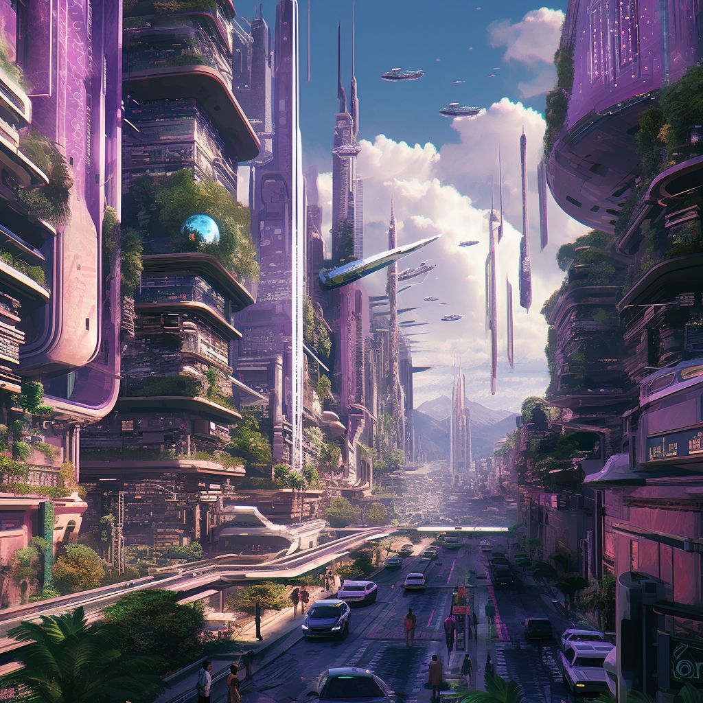 Source: Zapier / Prompt: A futuristic hopeful busy city, purple and green color scheme. Generated with Midjourney.