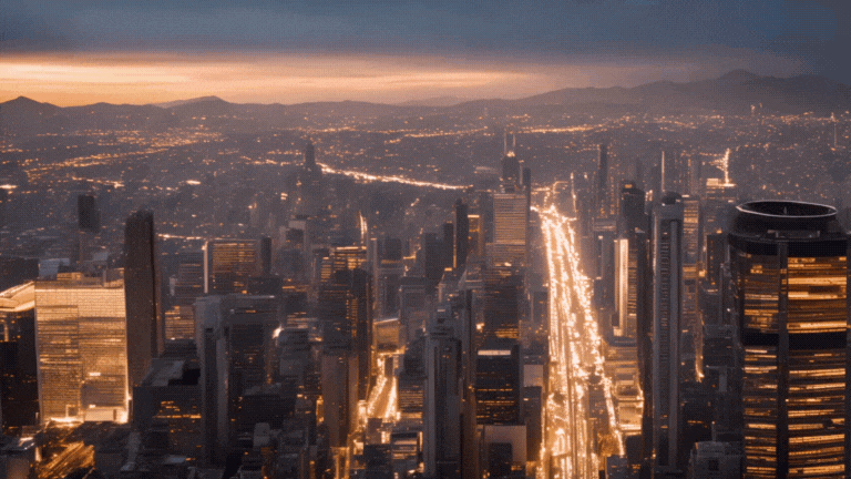 Prompt: A slow, sweeping camera pan across a vast, futuristic cityscape at sunset, gradually increasing in intensity to emphasize the scale and grandeur of the city.