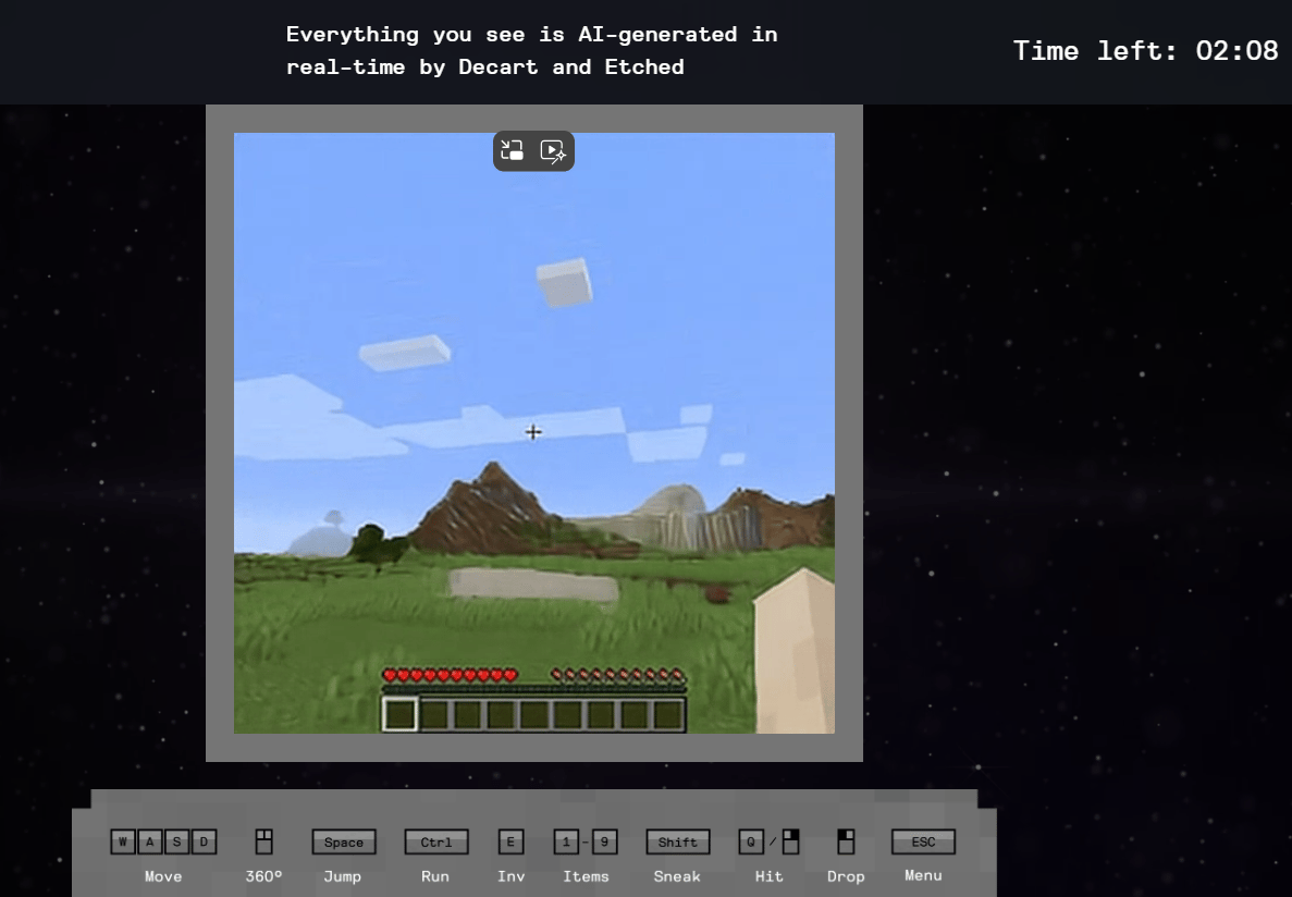 AI companies Etched and Decart have launched "Oasis," an AI-driven video game that responds instantly to player actions. Inspired by Minecraft, players can jump, move, and collect items in a world built entirely by AI, with each frame generating in 0.04 seconds—eliminating latency. Unlike other models that take seconds to render each frame, Oasis offers seamless, real-time interaction using Vision Transformer and diffusion models for smooth gameplay.