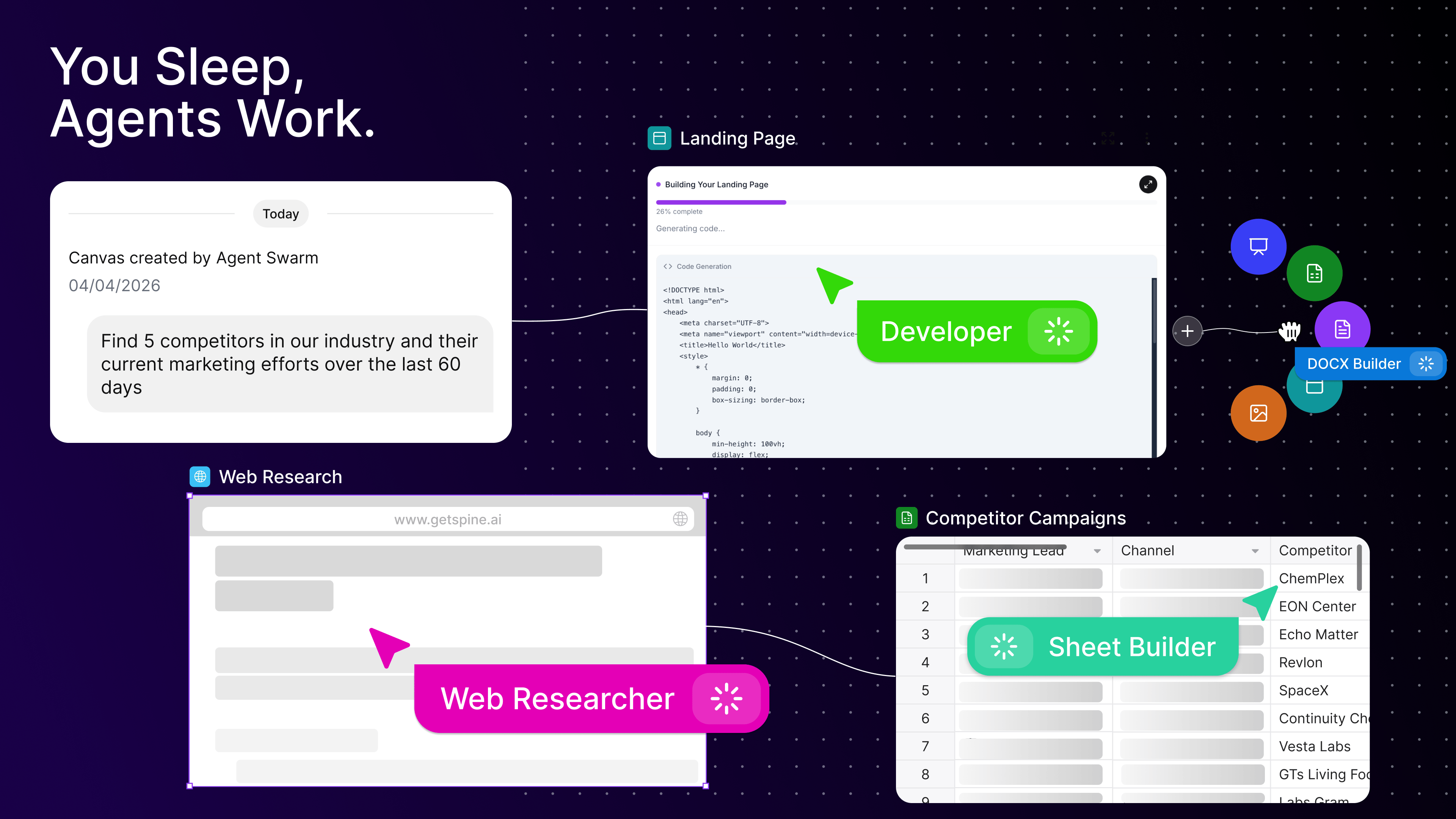 Spine deploys a swarm of specialized agents that work 24/7. They browse the web, conduct deep research, analyze markets, build strategy documents, and more.