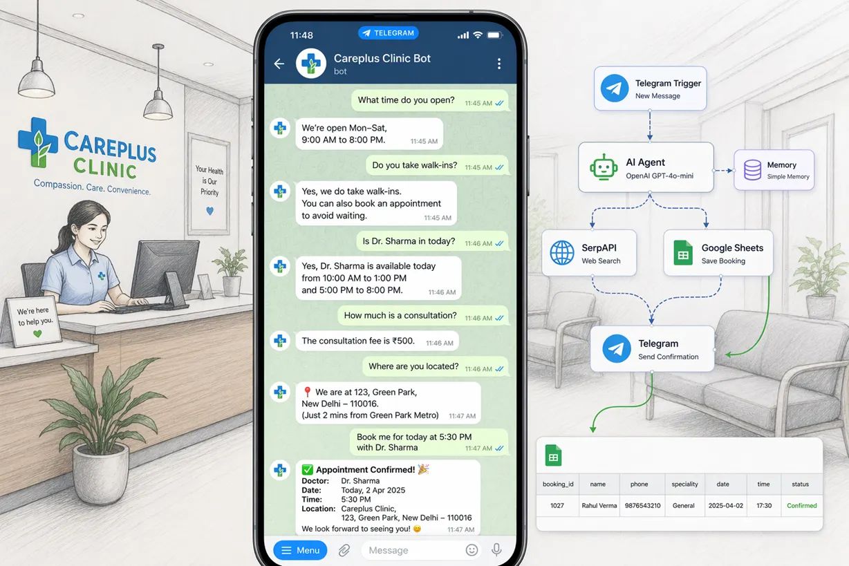 This n8n + OpenAI setup turns a Telegram bot into a clinic assistant that handles FAQs, appointment bookings, Google Sheets logging, and confirmations with drag-and-drop automation, without servers or backend.