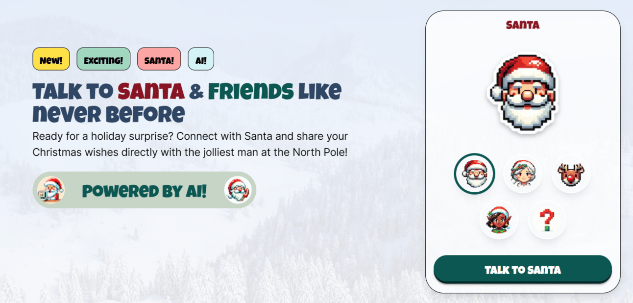 Created by Fixie, this innovative web experience lets you chat in real-time with Santa, Rudolph, Mrs. Claus, and more using AI voice calls.