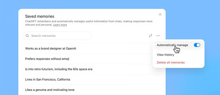 ChatGPT now automatically organizes your saved memories keeping what matters most top of mind and quietly archiving older or less relevant details. This update prevents "memory full" errors, enhances recall speed and intelligence, and allows you to search, sort, and prioritize memories. Now available to Plus and Pro users globally, it makes ChatGPT more personal, seamless, and reliable.