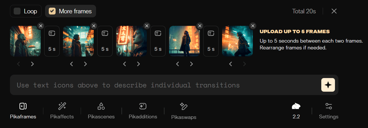 Pikaframes just leveled up—now letting you stitch up to 5 frames into a seamless 25-second AI-generated video. Your photos don’t just animate—they evolve, transform, and tell a story. It’s cinematic magic, powered by prompts. Say goodbye to static and hello to motion.