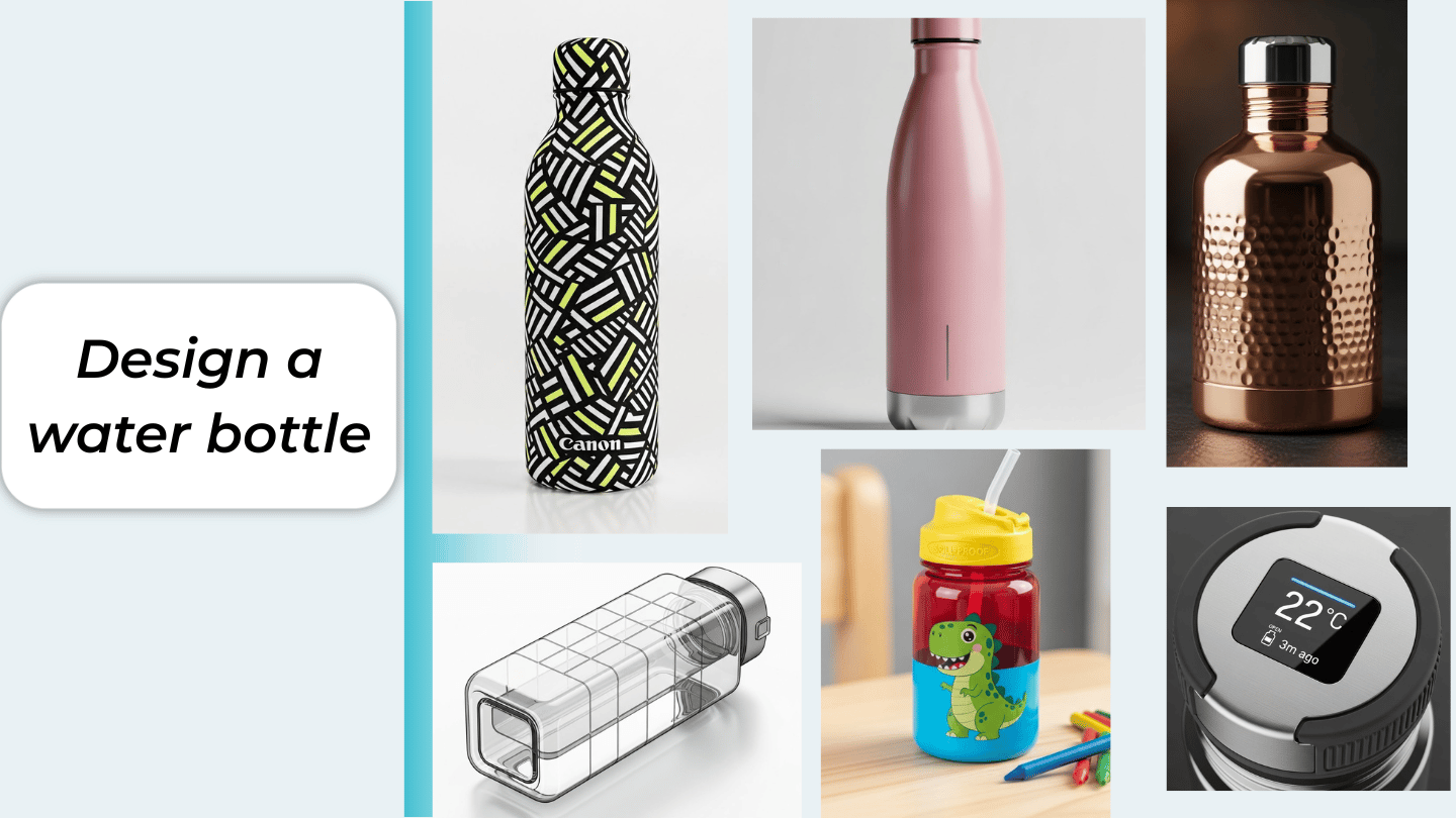 Prompt: “Design a sleek reusable water bottle with pastel gradients + eco-friendly packaging.”
