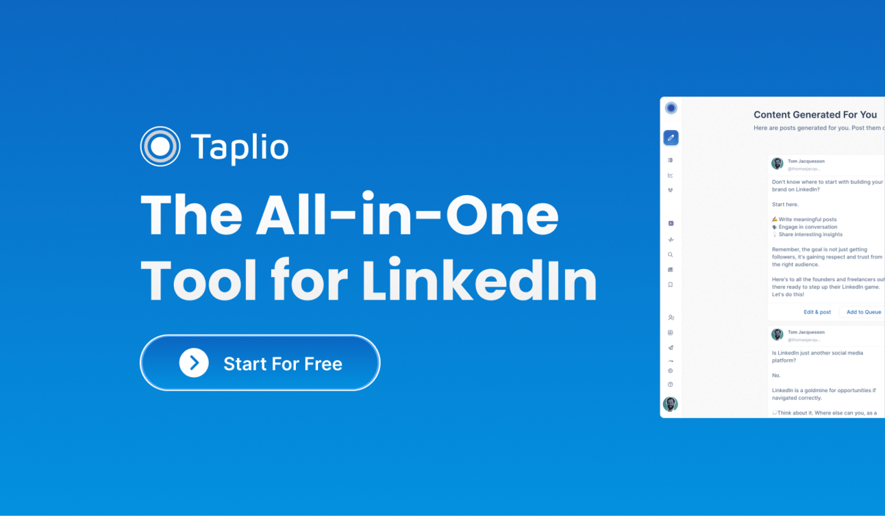 Do you find it hard to create high-performing content? To engage with the right people? Or do you just not have the time and focus to get results? Taplio helps tackle all of those with its advanced features: AI-powered content, advanced scheduling, engagement, lead generation and more.