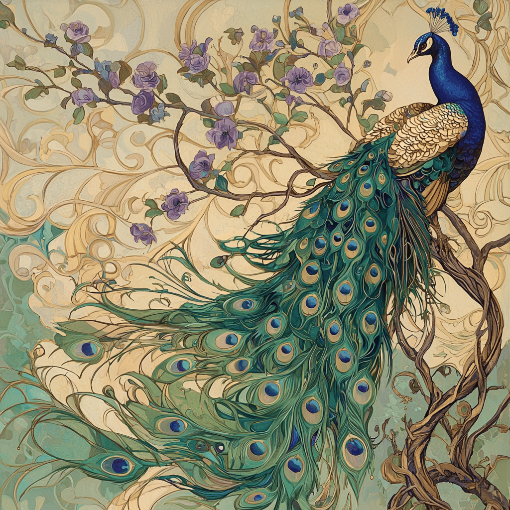 Prompt 1: An elegant peacock perched on a tree branch with swirling, intricate feathers intertwining with blooming flowers, all set against a decorative backdrop of curved, flowing lines in the Art Nouveau style, featuring detailed patterns in soft greens, blues, and purples with gold accents.âv6.1--
