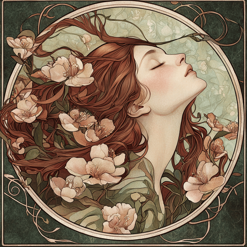 Prompt 2: Art Nouveau portrait with flowing hair transforming into blooming flowers, capturing the unity of woman and nature.âv6.1