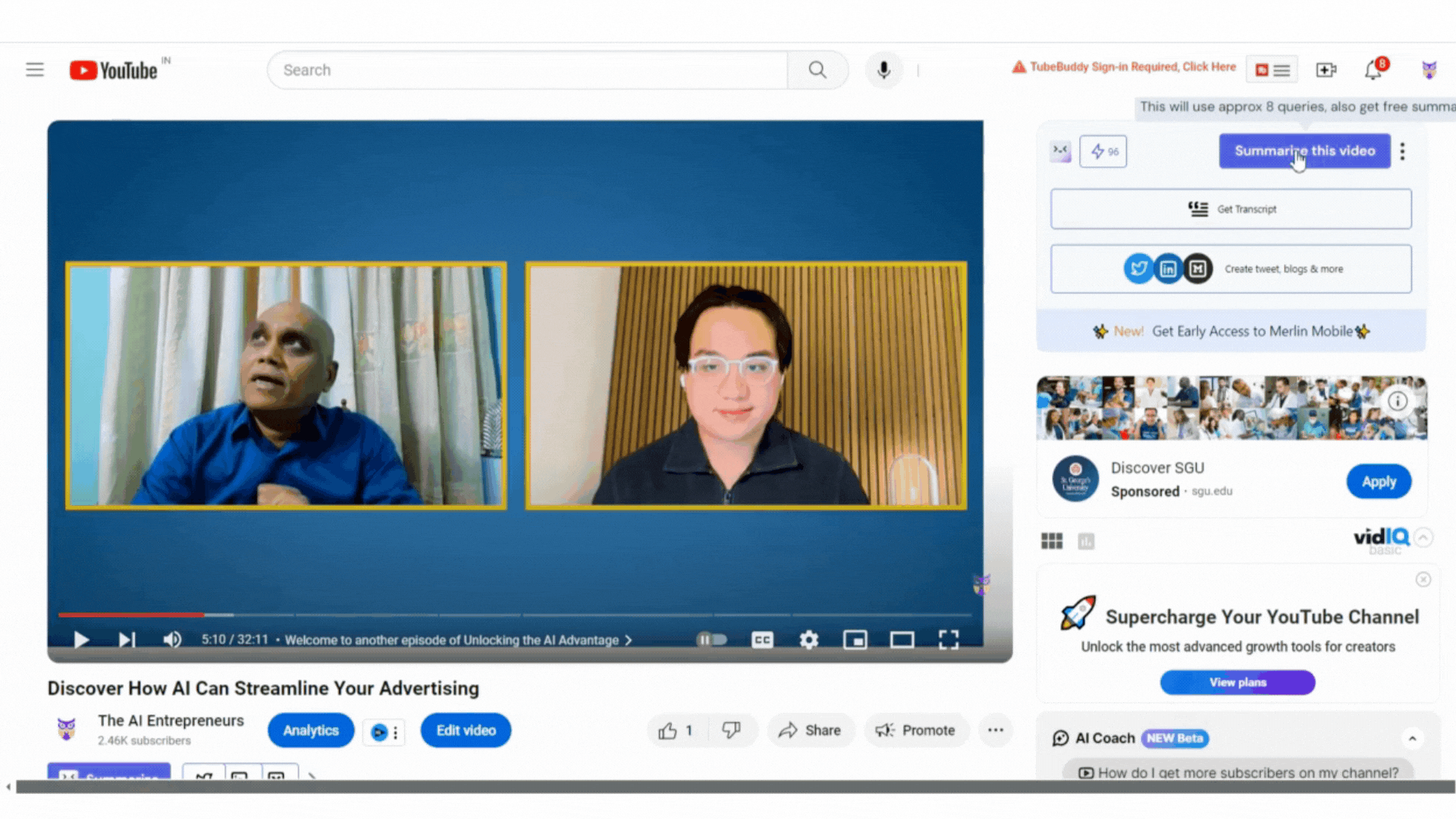 Use-case 1: On YouTube, summarize any video for a quick overview. The summary is timestamped, so you can click and jump to that particular part. You can chat with the summary as well. Just besides summarize there’s a button to “Get Transcript”, click on that to get the entire video transcript which can be downloaded