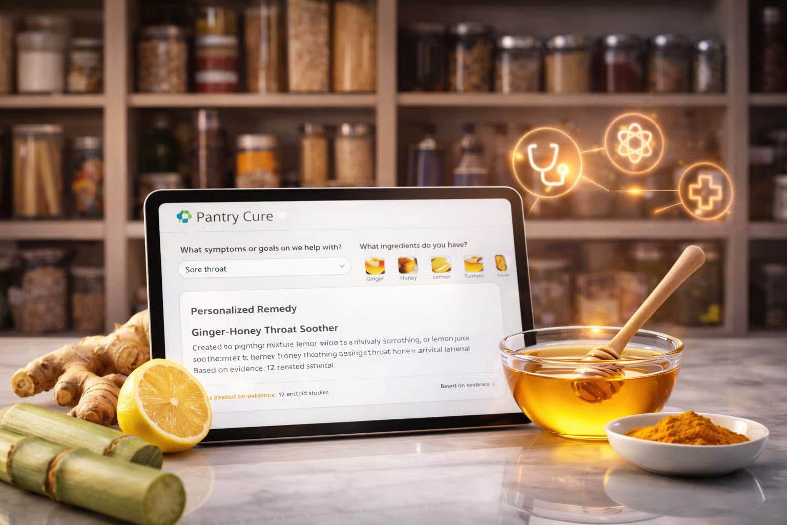 Pantry Cure uses an AI model to turn whateverโs already in your kitchen into personalized, evidenceโbased home remedies. Enter your symptoms or goals, list your pantry items, and it generates targeted suggestions built on natural compounds like ginger, turmeric, honey, and lemonโremoving the need for supplements or extra shopping.