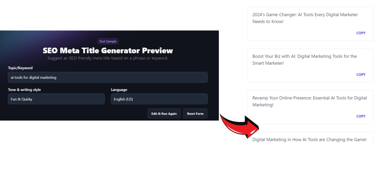 Step 4: Optimize meta title, click on “Meta title” from the left panel and enter your keyword or topic, your tone & writing style and language, hit “GENERATE”