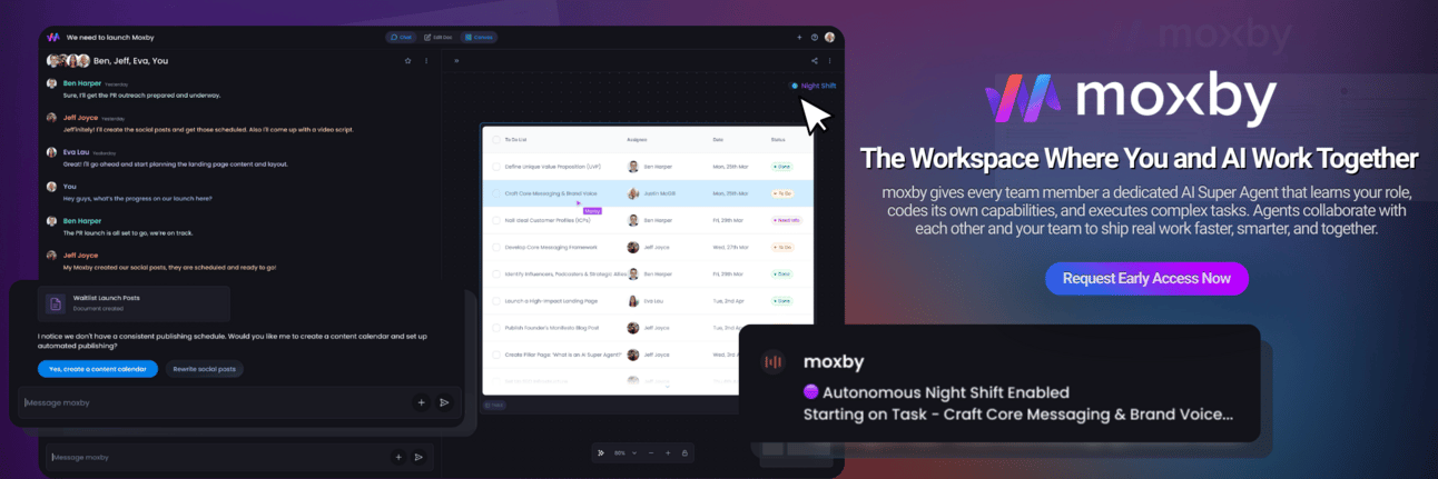 Your team just got supercharged. moxby gives every employee an AI agent that executes tasks, learns new skills, and even writes its own code to improve - no prompt engineering required.
