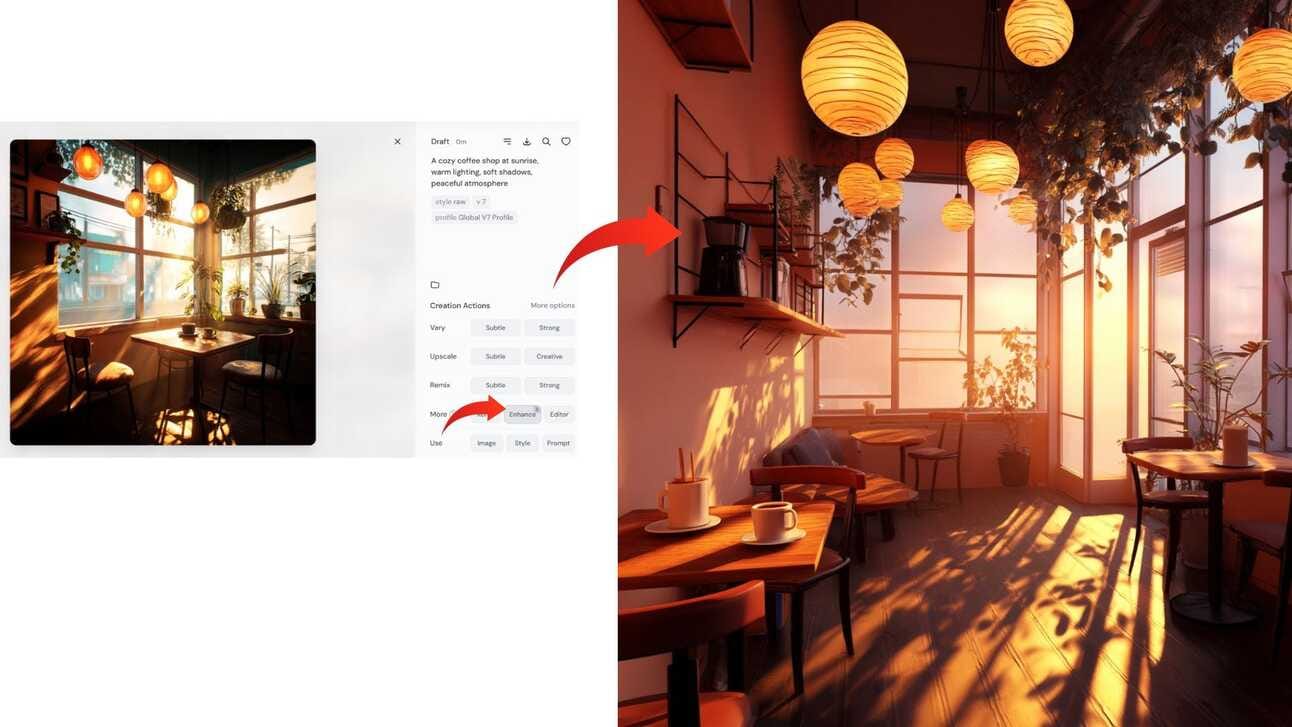 Start with: “Cozy coffee shop, sunrise glow --v 7” for blog headers.