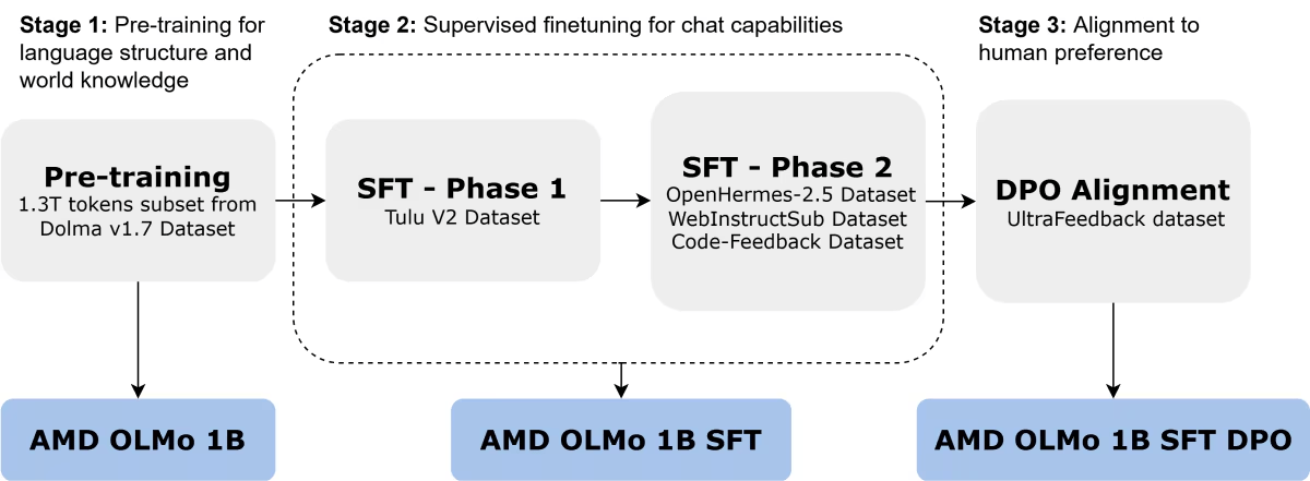 AMD has introduced OLMo 1B is AMD's first open-source language model with one billion parameters, designed for versatile hardware. It improves on the previous OLMo architecture with fewer data tokens and a three-phase training process: foundational training, supervised fine-tuning, and alignment with human preferences. This results in a 2.6% performance edge over other open-source models in benchmarks.