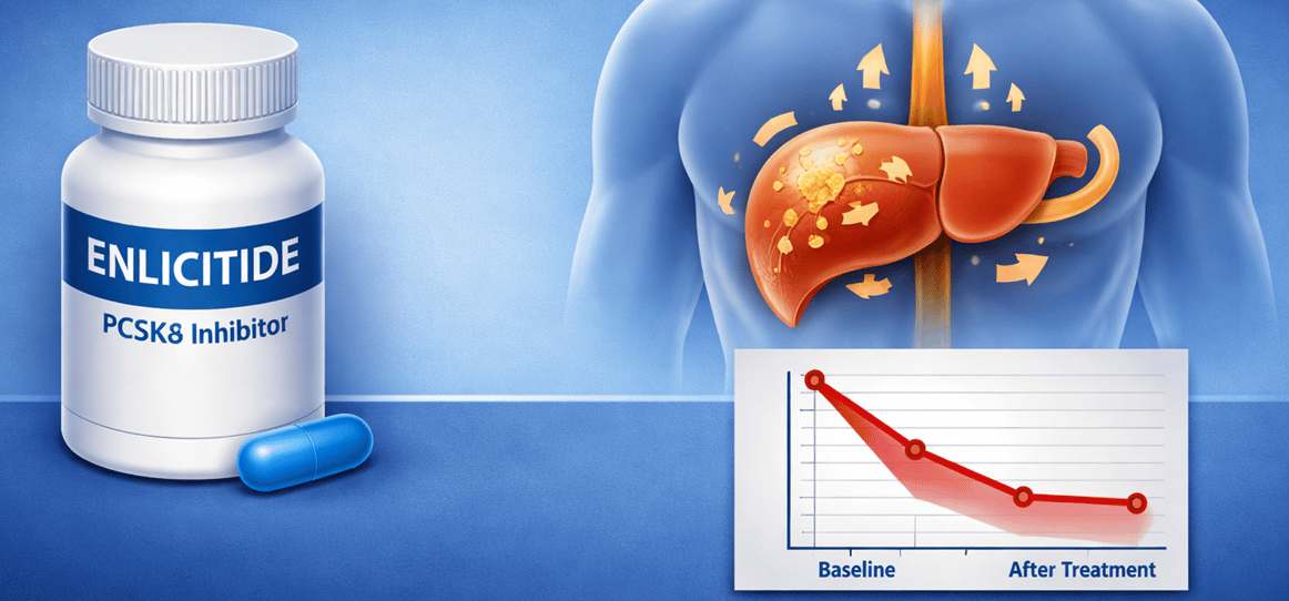A phase-three trial shows that enlicitide, an oral PCSK9 inhibitor, reduces LDL by ~60%, similar to injectables. It enhances liver cholesterol clearance and offers the advantage of a simple daily pill, potentially improving adherence and outcomes.