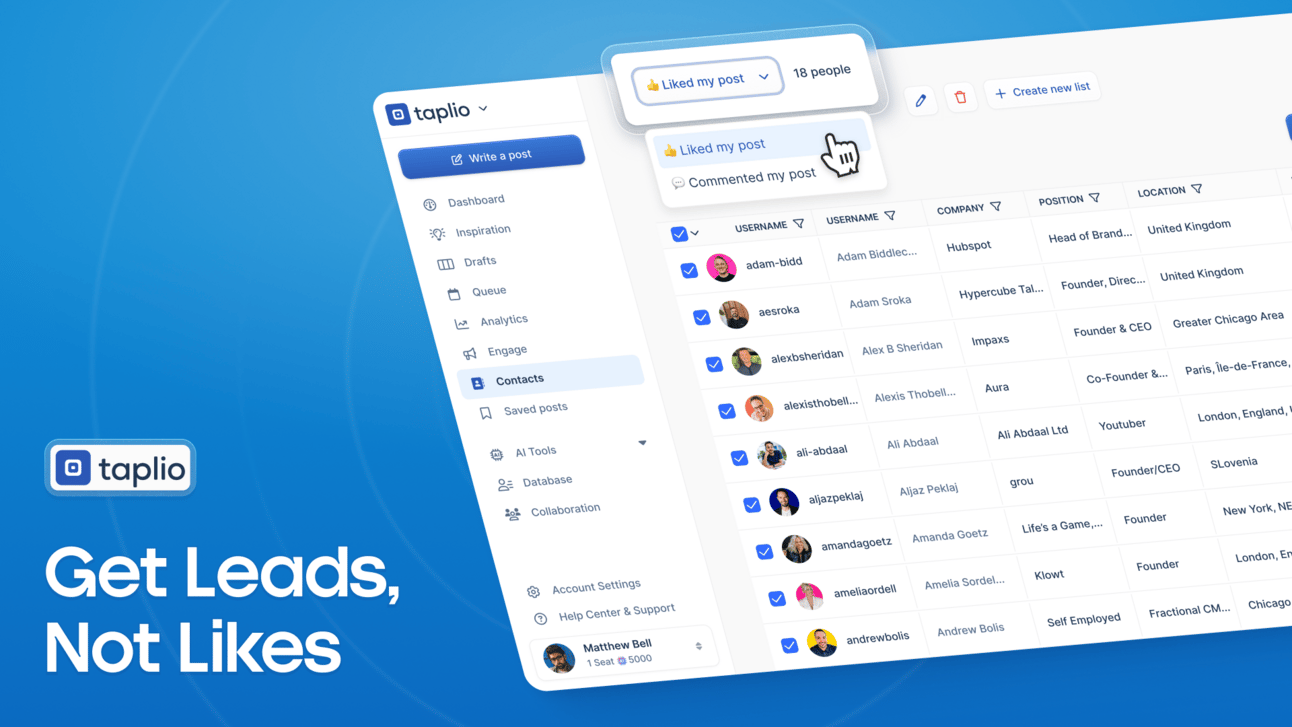 📈 Taplio also helps you build lead lists directly from people engaging with your posts—and even lets you add prospects straight from LinkedIn search.