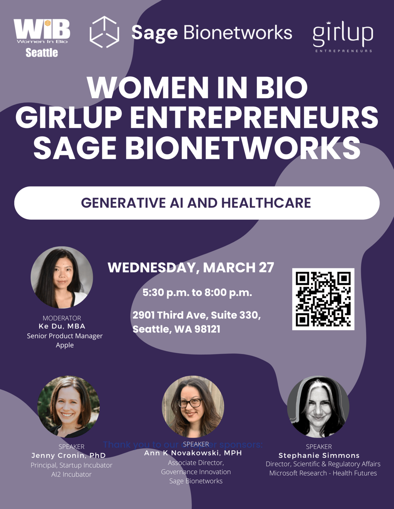 Join WIB-Seattle Events on March 27th, 2024, for a special event featuring four inspiring speakers who will share their insights on AI and Healthcare. This event is hosted by GirlUp Entrepreneurs and Women in BIO, with sponsorship from Sage Bionetworks.