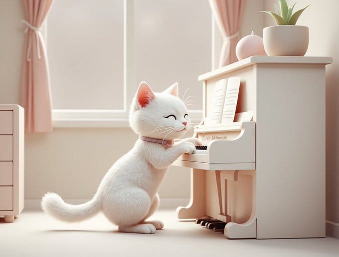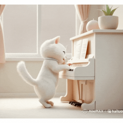 Use Hailuo AI to transform a static image of a cat at the piano into a dynamic video, where the cat playfully taps the keys.