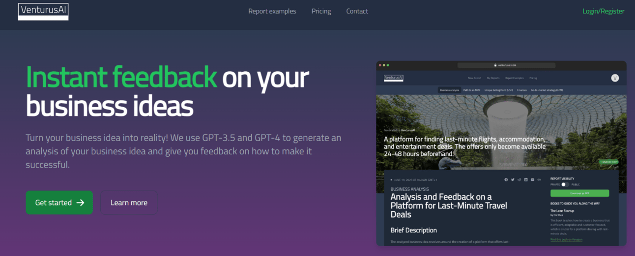 VenturusAI is an AI-powered tool that analyzes business ideas and generates reports.
