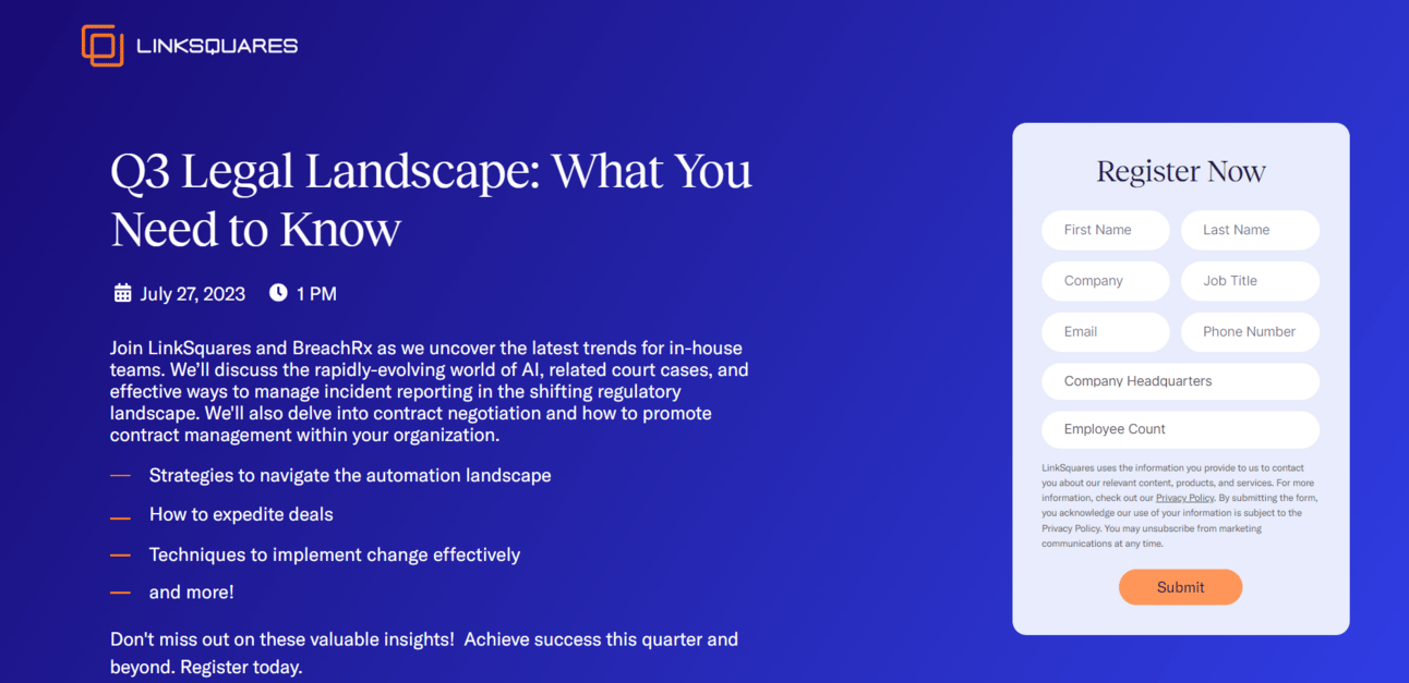 Join LinkSquares and BreachRx as they explore AI trends, court cases, incident reporting, regulatory changes, contract negotiation, and promoting contract management within an organization.